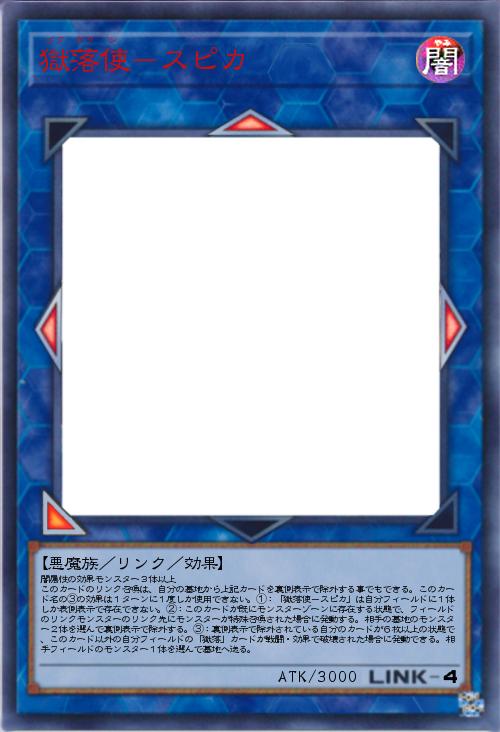 | 闇属性の効果モンスター3体以上 このカードのリンク召喚は、自分の墓地から上記カードを裏側表示で除外する事でもできる。このカード名の③の効果は1ターンに1度しか使用できない。①:「獄落使-スピカ」は自分フィールドに1体しか表側表示で存在できない。②:このカードが既にモンスターゾーンに存在する状態で、フィールドのリンクモンスターのリンク先にモンスターが特殊召喚された場合に発動する。相手の墓地のモンスター2体を選んで裏側表示で除外する。③:裏側表示で除外されている自分のカードが6枚以上の状態で、このカード以外の自分フィールドの「獄落」カードが戦闘・効果で破壊された場合に発動できる。相手フィールドのモンスター1体を選んで墓地へ送る。 | |||