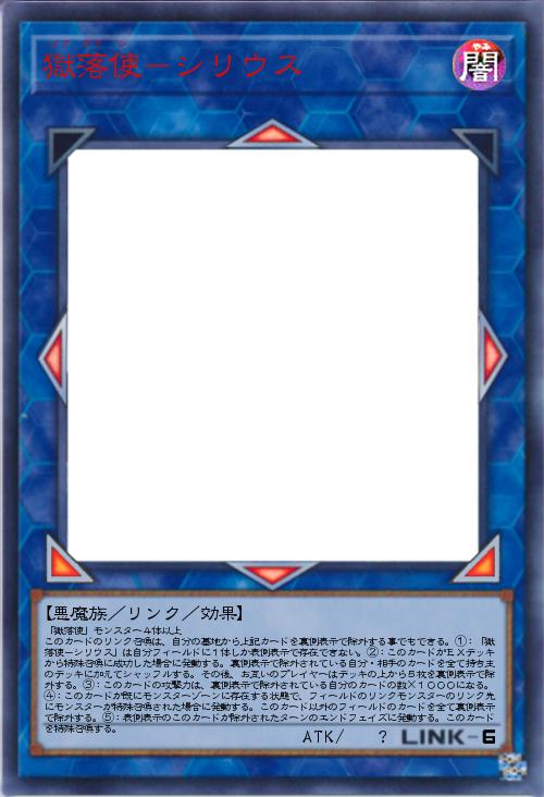 | 「獄落使」モンスター4体以上 このカードのリンク召喚は、自分の墓地から上記カードを裏側表示で除外する事でもできる。①:「獄落使-シリウス」は自分フィールドに1体しか表側表示で存在できない。②:このカードがEXデッキから特殊召喚に成功した場合に発動する。裏側表示で除外されている自分・相手のカードを全て持ち主のデッキに加えてシャッフルする。その後、お互いのプレイヤーはデッキの上から5枚を裏側表示で除外する。③:このカードの攻撃力は、裏側表示で除外されている自分のカードの数×1000になる。④:このカードが既にモンスターゾーンに存在する状態で、フィールドのリンクモンスターのリンク先にモンスターが特殊召喚された場合に発動する。このカード以外のフィールドのカードを全て裏側表示で除外する。⑤:表側表示のこのカードが除外されたターンのエンドフェイズに発動する。このカードを特殊召喚する。 | |||