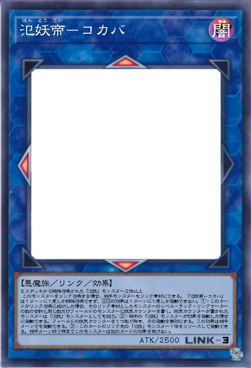 | EXデッキから特殊召喚された「氾妖」モンスター2体以上 このモンスターをリンク召喚する場合、相手モンスターもリンク素材にできる。「氾妖帝-コカバ」は1ターンに1度しか特殊召喚できず、②③の効果は1ターンに1度しか発動できない。①:このカードがリンク召喚に成功した場合、そのリンク素材としたモンスターのレベル・ランク・リンクマーカーの数の合計と同じ数だけフィールドのモンスターに妖気カウンターを置く。妖気カウンターが置かれたモンスターは「氾妖」モンスターとしても扱う。②:相手の「氾妖」モンスターが効果を発動した場合に発動できる。フィールドの妖気カウンターを1つ取り除き、その発動を無効にする。この効果は相手ターンでも発動できる。③:このカードのリンク先の「氾妖」モンスター1体をリリースして発動できる。相手ターン終了時までこのモンスターは他のカードの効果を受けない。 | |||