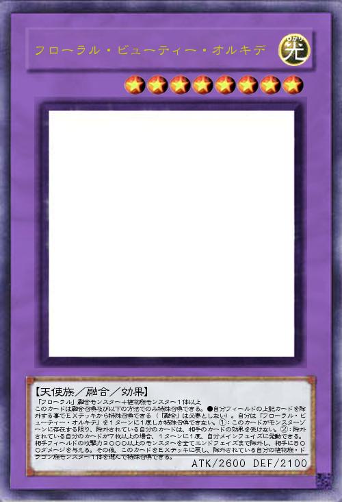 | 「フローラル」融合モンスター+植物族モンスター1体以上 このカードは融合召喚及び以下の方法でのみ特殊召喚できる。●自分フィールドの上記カードを除外する事でEXデッキから特殊召喚できる(「融合」は必要としない)。自分は「フローラル・ビューティー・オルキデ」を1ターンに1度しか特殊召喚できない。①:このカードがモンスターゾーンに存在する限り、除外されている自分のカードは、相手のカードの効果を受けない。②:除外されている自分のカードが7枚以上の場合、1ターンに1度、自分メインフェイズに発動できる。相手フィールドの攻撃力3000以上のモンスターを全てエンドフェイズまで除外し、相手に800ダメージを与える。その後、このカードをEXデッキに戻し、除外されている自分の植物族・ドラゴン族モンスター1体を選んで特殊召喚できる。 | |||