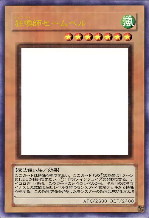 | このカードは特殊召喚できない。このカード名の①の効果は1ターンに1度しか使用できない。①:自分メインフェイズに発動できる。サイコロを1回振る。このカードの元々のレベルから、出た目の数をマイナスした数値と同じレベルを持つモンスター1体をデッキから特殊召喚する。この効果で特殊召喚したモンスターの効果は無効化される。 | |||