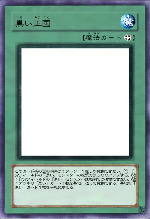 | このカード名の③の効果は1ターンに1度しか発動できない。①:自分フィールドの「黒い」モンスターの攻撃力は500アップする。②:自分フィールドの「黒い」モンスターは戦闘では破壊できない。③:デッキの「黒い」カード1枚を墓地に送って発動できる。墓地の「黒い」カード1枚を手札に加える。 | |||