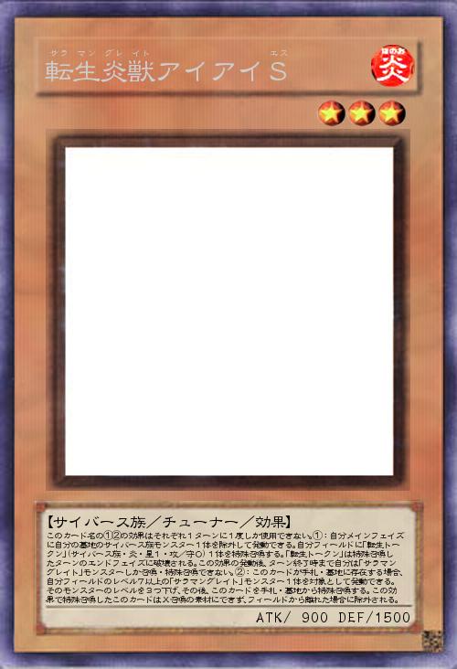 | このカード名の①②の効果はそれぞれ1ターンに1度しか使用できない。①:自分メインフェイズに自分の墓地のサイバース族モンスター1体を除外して発動できる。自分フィールドに「転生トークン」(サイバース族・炎・星1・攻/守0)1体を特殊召喚する。「転生トークン」は特殊召喚したターンのエンドフェイズに破壊される。この効果の発動後、ターン終了時まで自分は「サラマングレイト」モンスターしか召喚・特殊召喚できない。②:このカードが手札・墓地に存在する場合、自分フィールドのレベル7以上の「サラマングレイト」モンスター1体を対象として発動できる。そのモンスターのレベルを3つ下げ、その後、このカードを手札・墓地から特殊召喚する。この効果で特殊召喚したこのカードはX召喚の素材にできず、フィールドから離れた場合に除外される。 | |||