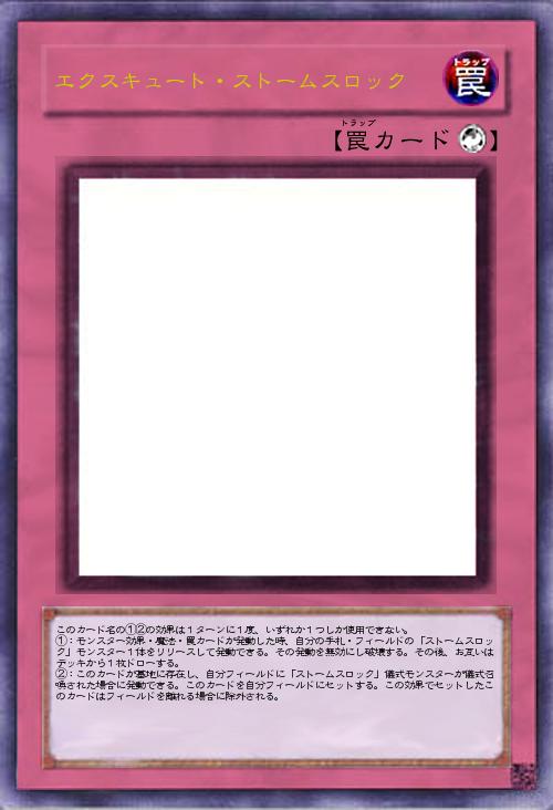 | このカード名の①②の効果は1ターンに1度、いずれか1つしか使用できない。 ①:モンスター効果・魔法・罠カードが発動した時、自分の手札・フィールドの「ストームスロック」モンスター1体をリリースして発動できる。その発動を無効にし破壊する。その後、お互いはデッキから1枚ドローする。 ②:このカードが墓地に存在し、自分フィールドに「ストームスロック」儀式モンスターが儀式召喚された場合に発動できる。このカードを自分フィールドにセットする。この効果でセットしたこのカードはフィールドを離れる場合に除外される。 | |||