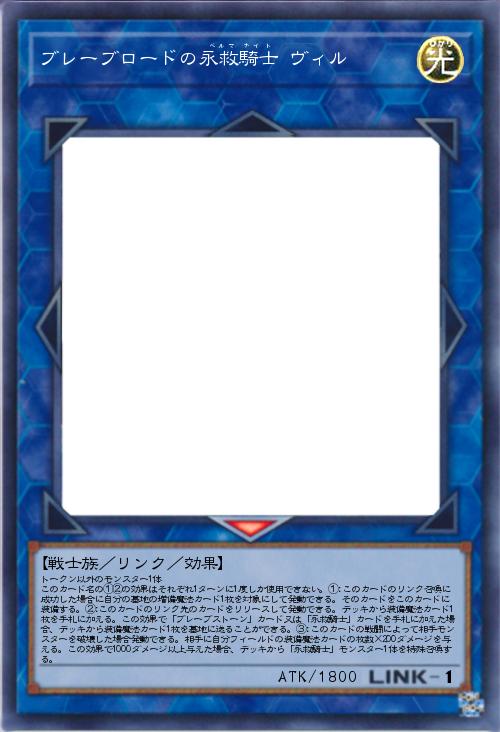 | トークン以外のモンスター1体 このカード名の①②の効果はそれぞれ1ターンに1度しか使用できない。①:このカードのリンク召喚に成功した場合に自分の墓地の増備魔法カード1枚を対象にして発動できる。そのカードをこのカードに装備する。②:このカードのリンク先のカードをリリースして発動できる。デッキから装備魔法カード1枚を手札に加える。この効果で「ブレーブストーン」カード又は「永救騎士」カードを手札に加えた場合、デッキから装備魔法カード1枚を墓地に送ることができる。③:このカードの戦闘によって相手モンスターを破壊した場合発動できる。相手に自分フィールドの装備魔法カードの枚数×200ダメージを与える。この効果で1000ダメージ以上与えた場合、デッキから「永救騎士」モンスター1体を特殊召喚する。 | |||