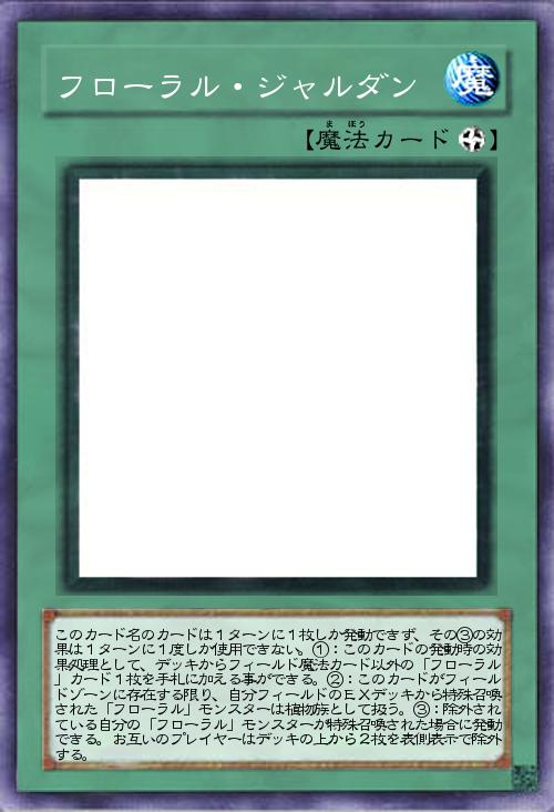 | このカード名のカードは1ターンに1枚しか発動できず、その③の効果は1ターンに1度しか使用できない。①:このカードの発動時の効果処理として、デッキからフィールド魔法カード以外の「フローラル」カード1枚を手札に加える事ができる。②:このカードがフィールドゾーンに存在する限り、自分フィールドのEXデッキから特殊召喚された「フローラル」モンスターは植物族として扱う。③:除外されている自分の「フローラル」モンスターが特殊召喚された場合に発動できる。お互いのプレイヤーはデッキの上から2枚を表側表示で除外する。 | |||