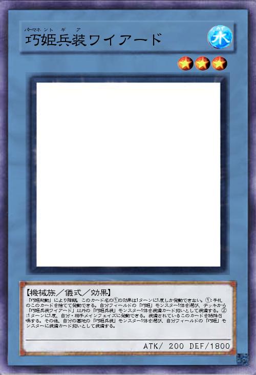 | 「巧姫起動」により降臨。このカード名の①の効果は1ターンに1度しか発動できない。①:手札のこのカードを捨てて発動できる。自分フィールドの「巧姫」モンスター1体を選び、デッキから「巧姫兵装ワイアード」以外の「巧姫兵装」モンスター1体を装備カード扱いとして装備する。②:1ターンに1度、自分・相手メインフェイズに発動できる。装備されているこのカードを特殊召喚する。その後、自分の墓地の「巧姫兵装」モンスター1体を選び、自分フィールドの「巧姫」モンスターに装備カード扱いとして装備する。 | |||