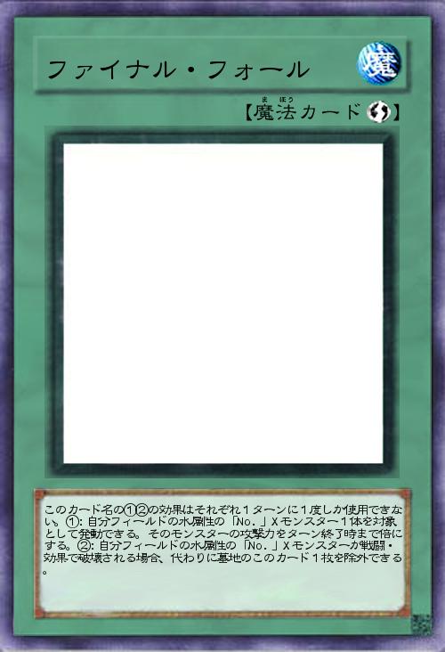 | このカード名の①②の効果はそれぞれ1ターンに1度しか使用できない。①:自分フィールドの水属性の「No.」Xモンスター1体を対象として発動できる。そのモンスターの攻撃力をターン終了時まで倍にする。②:自分フィールドの水属性の「No.」Xモンスターが戦闘・効果で破壊される場合、代わりに墓地のこのカード1枚を除外できる。 | |||