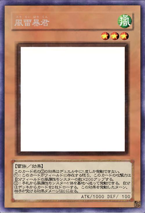 | このカード名の②の効果はデュエル中に1度しか発動できない。 ①:このカードがフィールドに存在する限り、このカードの攻撃力は自分フィールドの風属性モンスターの数×200アップする。 ②:手札から風属性モンスター1体を墓地へ送って発動できる。自分はデッキからカードを2枚ドローする。この効果を発動したターン、相手が受ける効果ダメージは0になる。 | |||