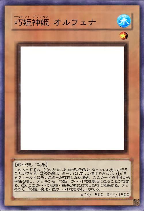 | このカード名の、①の方法による特殊召喚は1ターンに1度しか行うことができず、②の効果は1ターンに1度しか使用できない。①:自分フィールドにモンスターが存在しない場合。このカードを手札から特殊召喚し、デッキから「巧姫」カード1枚を墓地に送ることができる。②:このカードが召喚・特殊召喚に成功した時に発動する。デッキから「巧姫」魔法・罠カード1枚を手札に加える。 | |||
