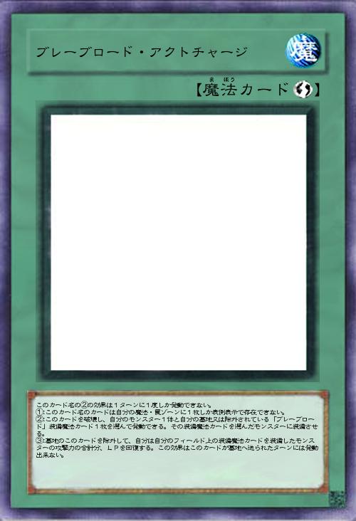 | このカード名の②の効果は1ターンに1度しか発動できない。 ①:このカード名のカードは自分の魔法・罠ゾーンに1枚しか表側表示で存在できない。 ②:このカードを破壊し、自分のモンスター1体と自分の墓地又は除外されている「ブレーブロード」装備魔法カード1枚を選んで発動できる。その装備魔法カードを選んだモンスターに装備させる。 ③:墓地のこのカードを除外して、自分は自分のフィールド上の装備魔法カードを装備したモンスターの攻撃力の合計分、LPを回復する。この効果はこのカードが墓地へ送られたターンには発動出来ない。 | |||
