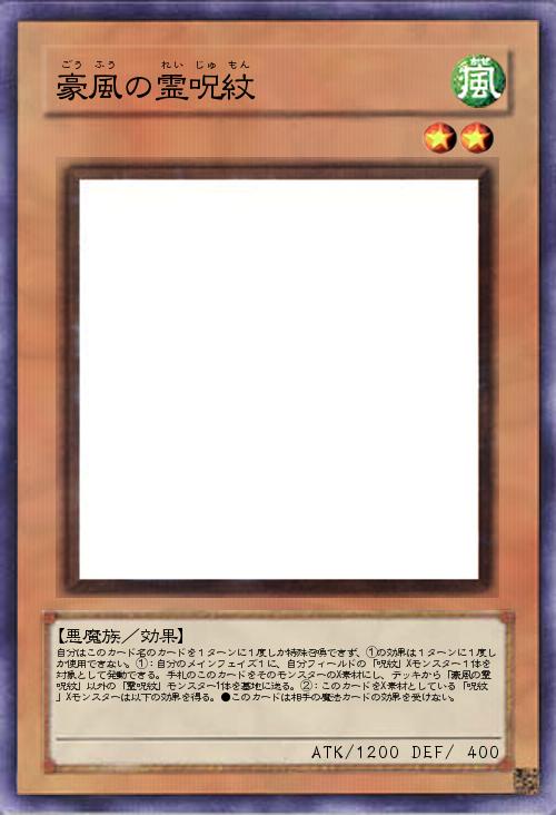 | 自分はこのカード名のカードを1ターンに1度しか特殊召喚できず、①の効果は1ターンに1度しか使用できない。①:自分のメインフェイズ1に、自分フィールドの「呪紋」Xモンスター1体を対象として発動できる。手札のこのカードをそのモンスターのX素材にし、デッキから「豪風の霊呪紋」以外の「霊呪紋」モンスター1体を墓地に送る。②:このカードをX素材としている「呪紋」Xモンスターは以下の効果を得る。●このカードは相手の魔法カードの効果を受けない。 | |||