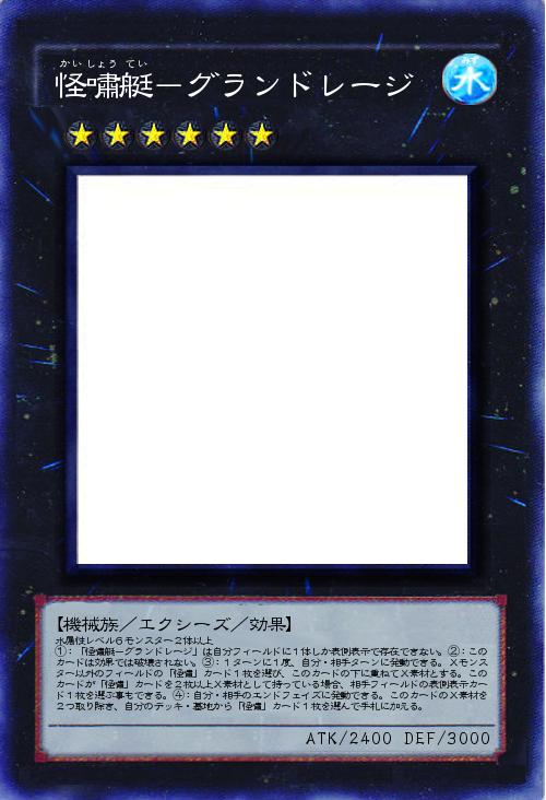 | 水属性レベル6モンスター2体以上 ①:「怪嘯艇-グランドレージ」は自分フィールドに1体しか表側表示で存在できない。②:このカードは効果では破壊されない。③:1ターンに1度、自分・相手ターンに発動できる。Xモンスター以外のフィールドの「怪嘯」カード1枚を選び、このカードの下に重ねてX素材とする。このカードが「怪嘯」カードを2枚以上X素材として持っている場合、相手フィールドの表側表示カード1枚を選ぶ事もできる。④:自分・相手のエンドフェイズに発動できる。このカードのX素材を2つ取り除き、自分のデッキ・墓地から「怪嘯」カード1枚を選んで手札に加える。 | |||