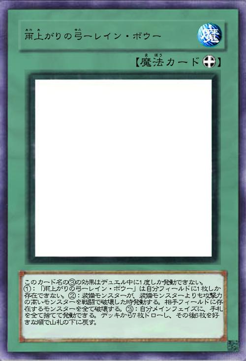 | このカード名の③の効果はデュエル中に1度しか発動できない。 ①:「雨上がりの弓ーレイン・ボウー」は自分フィールドに1枚しか存在できない。②:装備モンスターが、装備モンスターよりも攻撃力の高いモンスターを戦闘で破壊した時発動する。相手フィールドに存在するモンスターを全て破壊する。③:自分メインフェイズに、手札を全て捨てて発動できる。デッキから7枚ドローし、その後6枚を好きな順で山札の下に戻す。 | |||
