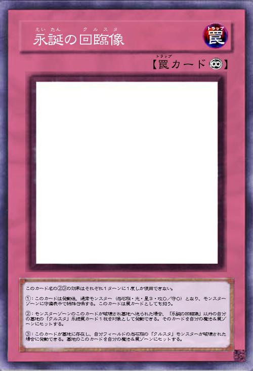 | このカード名の②③の効果はそれぞれ1ターンに1度しか使用できない。 ①:このカードは発動後、通常モンスター(岩石族・光・星3・攻0/守0)となり、モンスターゾーンに守備表示で特殊召喚する。このカードは罠カードとしても扱う。 ②:モンスターゾーンのこのカードが破壊され墓地へ送られた場合、「永誕の回臨像」以外の自分の墓地の「クルスタ」永続罠カード1枚を対象として発動できる。そのカードを自分の魔法&罠ゾーンにセットする。 ③:このカードが墓地に存在し、自分フィールドの岩石族の「クルスタ」モンスターが破壊された場合に発動できる。墓地のこのカードを自分の魔法&罠ゾーンにセットする。 | |||