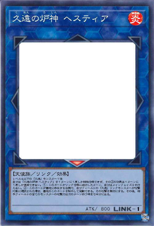 | レベル4以下の「久遠」モンスター1体 自分は「久遠の炉神 ヘスティア」を1ターンに1度しか特殊召喚できず、その②の効果は1ターンに1度しか使用できない。①:このカードがリンク召喚に成功したターン、自分はメインフェイズ2を行えない。②:このカードが墓地に存在する状態で、自分フィールドの「久遠」リンクモンスターが攻撃対象に選択された場合、墓地のこのカードを除外して発動できる。その攻撃を無効にする。その後、相手フィールドの全てのモンスターの攻撃力は次のターン終了時まで半分になる。 | |||