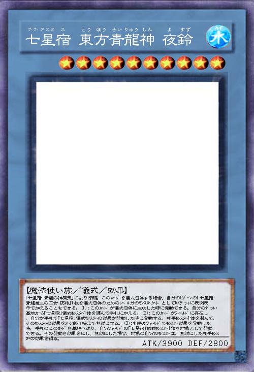 | 「七星宿 青龍の神座宝」により降臨。このカードを儀式召喚する場合、自分のPゾーンの「七星宿 青龍君主の巫女 夜鈴」1枚を儀式召喚のためのレベル分のモンスターカードとしてEXデッキに表側表示で加えることもできる。(1):このカードが儀式召喚に成功した時に発動できる。自分のデッキ・墓地から「七星宿」儀式モンスター1体を選んで手札に加える。(2):このカードがフィールドに存在し、自分が手札で「七星宿」儀式モンスターの効果が発動した時に発動する。相手モンスター1体を選んで、そのモンスターの効果をターン終了時まで無効にする。(3):相手がフィールドでモンスター効果を発動した時、手札のこのカードを墓地へ送り、自分フィールドの「七星宿」儀式モンスター1体を対象として発動できる。その発動を効果をにし、無効にした場合、対象の自分のモンスターは、無効にした相手モンスターの効果を得る。 | |||