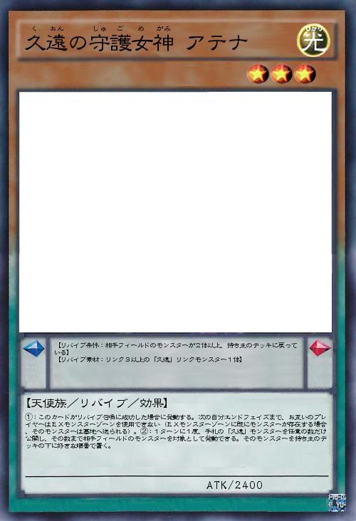 | ①:このカードがリバイブ召喚に成功した場合に発動する。次の自分エンドフェイズまで、お互いのプレイヤーはEXモンスターゾーンを使用できない(EXモンスターゾーンに既にモンスターが存在する場合、そのモンスターは墓地へ送られる)。②:1ターンに1度、手札の「久遠」モンスターを任意の数だけ公開し、その数まで相手フィールドのモンスターを対象として発動できる。そのモンスターを持ち主のデッキの下に好きな順番で置く。 | |||