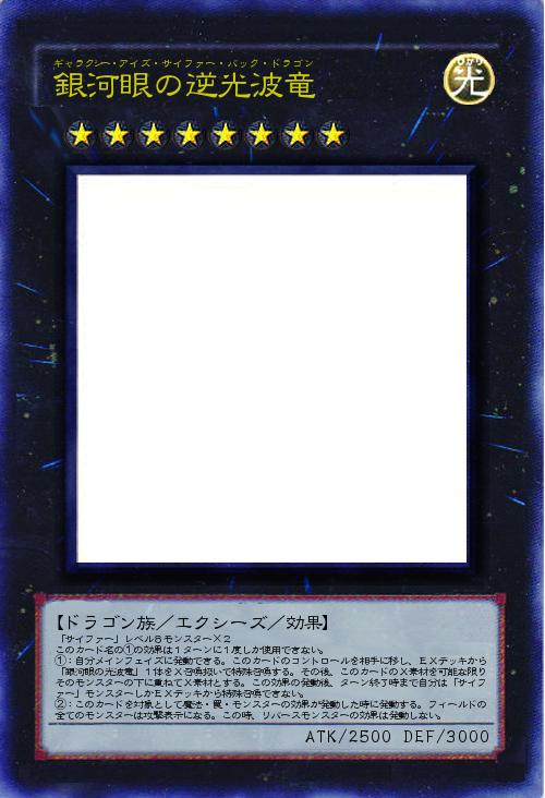 | 「サイファー」レベル8モンスター×2 このカード名の①の効果は1ターンに1度しか使用できない。 ①:自分メインフェイズに発動できる。このカードのコントロールを相手に移し、EXデッキから「銀河眼の光波竜」1体をX召喚扱いで特殊召喚する。その後、このカードのX素材を可能な限りそのモンスターの下に重ねてX素材とする。この効果の発動後、ターン終了時まで自分は「サイファー」モンスターしかEXデッキから特殊召喚できない。 ②:このカードを対象として魔法・罠・モンスターの効果が発動した時に発動する。フィールドの全てのモンスターは攻撃表示になる。この時、リバースモンスターの効果は発動しない。 | |||