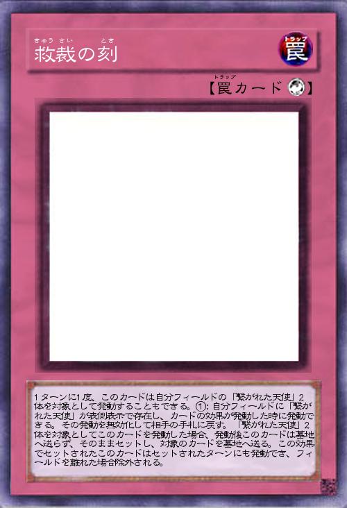 | 1ターンに1度、このカードは自分フィールドの「繋がれた天使」2体を対象として発動することもできる。①:自分フィールドに「繋がれた天使」が表側表示で存在し、カードの効果が発動した時に発動できる。その発動を無効化して相手の手札に戻す。「繋がれた天使」2体を対象としてこのカードを発動した場合、発動後このカードは墓地へ送らず、そのままセットし、対象のカードを墓地へ送る。この効果でセットされたこのカードはセットされたターンにも発動でき、フィールドを離れた場合除外される。 | |||