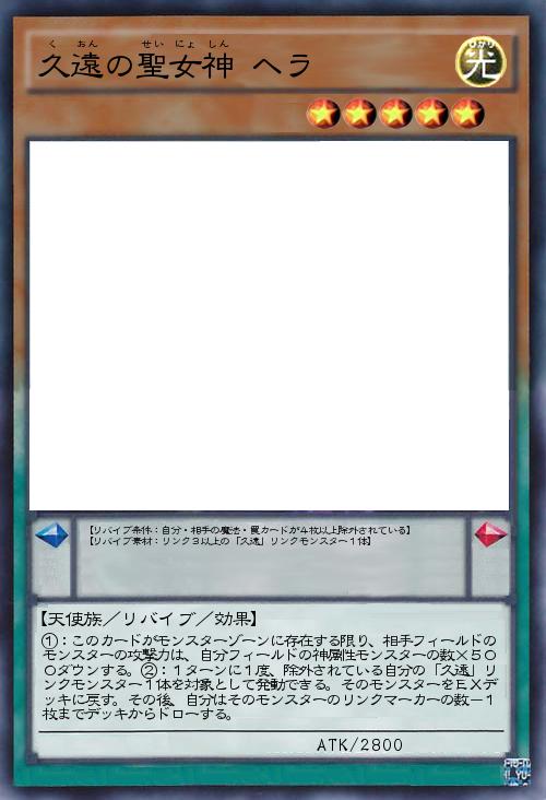 | ①:このカードがモンスターゾーンに存在する限り、相手フィールドのモンスターの攻撃力は、自分フィールドの神属性モンスターの数×500ダウンする。②:1ターンに1度、除外されている自分の「久遠」リンクモンスター1体を対象として発動できる。そのモンスターをEXデッキに戻す。その後、自分はそのモンスターのリンクマーカーの数-1枚までデッキからドローする。 | |||