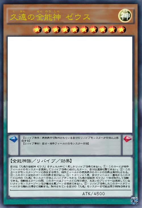 | 自分は「久遠の全能神 ゼウス」をデュエル中に1度しかリバイブ召喚できない。①:このカードが相手フィールドのモンスターを使用してリバイブ召喚に成功したターン、自分は直接攻撃できない。②:このカードがモンスターゾーンに存在する限り、相手フィールドの表側表示のカードの効果は無効化される。③:このカードは他のカードの効果を受けない。④:1ターンに1度、自分フィールド・墓地からこのカード以外の「久遠」モンスター5体とリバイブデッキから「久遠の全能神 ゼウス」1体を除外して発動できる。発動後4ターンの間、このカードはフィールドに残り続け、お互いのプレイヤーは使用していないメインモンスターゾーン及び魔法&罠ゾーンを使用できない。⑤:リバイブ召喚したこのカードがフィールドから離れた場合に発動する。除外されている自分の「久遠」モンスターを可能な限り特殊召喚する。 | |||