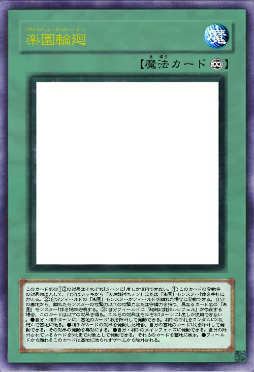 | このカード名の①②の効果はそれぞれ1ターンに1度しか使用できない。①:このカードの発動時の効果処理として、自分はデッキから「天源龍神エデン」または「楽園」モンスター1体を手札に加える。②:自分フィールドの「楽園」モンスターがフィールドを離れた場合に発動できる。自分の墓地から、離れたモンスターの攻撃力以下の攻撃力または守備力を持つ、異なるカード名の「楽園」モンスター1体を特殊召喚する。③:自分フィールドに「超越幻龍神ルシフェル」が存在する場合、このカードは以下の効果を得る。これらの効果はそれぞれ1ターンに1度しか使用できない。●自分・相手ターンに、墓地のカード1枚を除外して発動できる。相手の手札をランダムに2枚選んで墓地に送る。●相手がカードの効果を発動した場合、自分の墓地のカード1枚を除外して発動できる。その効果の発動を無効にする。●自分・相手のメインフェイズに発動できる。自分の除外されて | |||