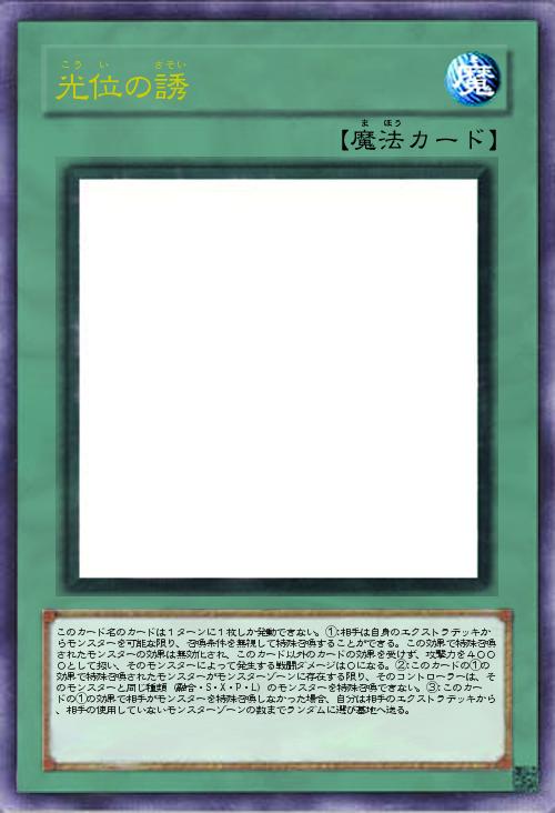 | このカード名のカードは1ターンに1枚しか発動できない。①:相手は自身のエクストラデッキからモンスターを可能な限り、召喚条件を無視して特殊召喚することができる。この効果で特殊召喚されたモンスターの効果は無効化され、このカード以外のカードの効果を受けず、攻撃力を4000として扱い、そのモンスターによって発生する戦闘ダメージは0になる。②:このカードの①の効果で特殊召喚されたモンスターがモンスターゾーンに存在する限り、そのコントローラーは、そのモンスターと同じ種類(融合・S・X・P・L)のモンスターを特殊召喚できない。③:このカードの①の効果で相手がモンスターを特殊召喚しなかった場合、自分は相手のエクストラデッキから、相手の使用していないモンスターゾーンの数までランダムに選び墓地へ送る。 | |||