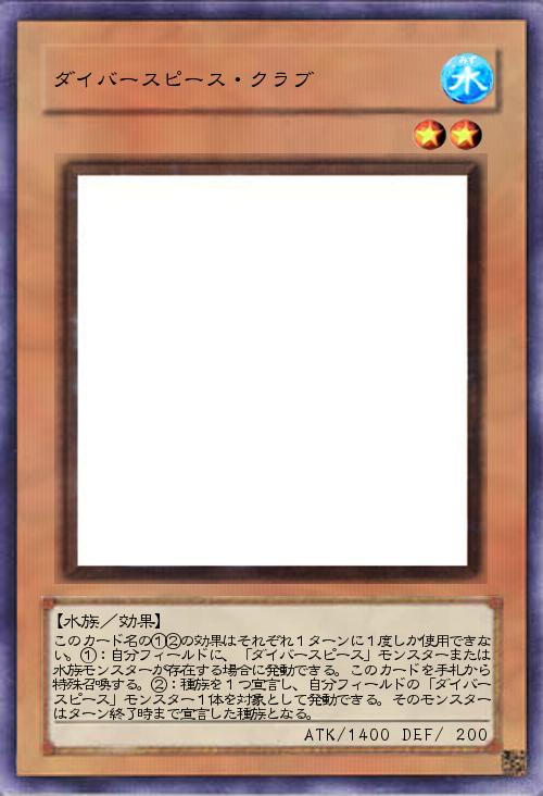 | このカード名の①②の効果はそれぞれ1ターンに1度しか使用できない。①:自分フィールドに、「ダイバースピース」モンスターまたは水族モンスターが存在する場合に発動できる。このカードを手札から特殊召喚する。②:種族を1つ宣言し、自分フィールドの「ダイバースピース」モンスター1体を対象として発動できる。そのモンスターはターン終了時まで宣言した種族となる。 | |||