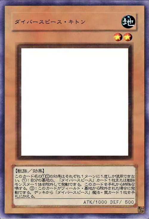 | このカード名の①②の効果はそれぞれ1ターンに1度しか使用できない。①:自分の墓地の、「ダイバースピース」カード1枚または獣族モンスター1体を除外して発動できる。このカードを手札から特殊召喚する。②:このカードがフィールド・墓地から除外された場合に発動できる。デッキから「ダイバースピース」魔法・罠カード1枚を手札に加える。 | |||