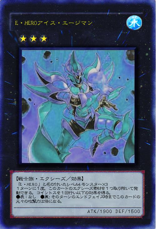 「E・HERO」と名の付いたレべル4モンスター×3 1ターンに1度、このカードのエクシーズ素材を1つ取り除いて発動できる。コイントスを1回行い以下の効果を得る。 ●表:なし ●裏:そのターンのエンドフェイズ時までこのカードの元々の攻撃力は倍になる。 |