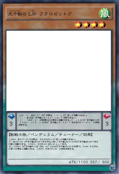 | このカード名の(2)のP効果は、1ターンに1度しか発動できない。 (1):自分は「天干獣」モンスターしか、P召喚できない。 (2):このカードが破壊された場合に発動できる。デッキから「天干獣の乙卯 フラロビットグ」以外の「天干獣」モンスター1体を自分フィールドに特殊召喚する。 | |||