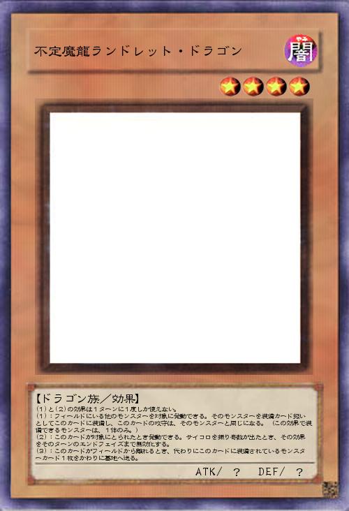 | (1)と(2)の効果は1ターンに1度しか使えない。 (1):フィールドにいる他のモンスターを対象に発動できる。そのモンスターを装備カード扱いとしてこのカードに装備し、このカードの攻守は、そのモンスターと同じになる。(この効果で装備できるモンスターは、1体のみ。) (2):このカードが対象にとられたとき発動できる。サイコロを振り奇数が出たとき、その効果をそのターンのエンドフェイズまで無効化する。 (3):このカードがフィールドから離れるとき、代わりにこのカードに装備されているモンスターカード1枚をかわりに墓地へ送る。 | |||