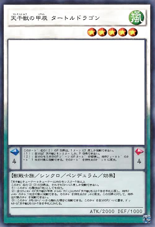| 「天干獣」チューナー+チューナー以外のモンスター1体以上 このカード名の(2)(3)の効果は、それぞれ1ターンに1度しか発動できない。 (1):このカードの属性は「地」としても扱う。 (2):自分フィールドの「天干獣の甲辰 タートルドラゴン」以外の「天干獣」モンスター1体を手札に戻し、相手フィールドのカード1枚を対象に発動できる。そのカードを持ち主のデッキに戻す。この効果に対して、相手は対象のカードを発動できない。 (3):このカードがモンスターゾーンから離れた場合に発動できる。このカードを自分のPゾーンに置き、デッキから「天干獣」モンスター1体を手札に加える。 | |||