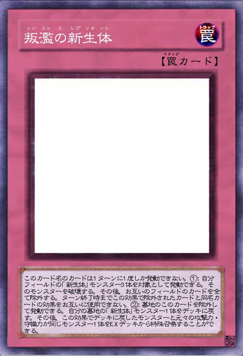 | このカード名のカードは1ターンに1度しか発動できない。①:自分フィールドの「新生体」モンスター3体を対象として発動できる。そのモンスターを破壊する。その後、お互いのフィールドのカードを全て除外する。ターン終了時までこの効果で除外されたカードと同名カードの効果をお互いに使用できない。②:墓地のこのカードを除外して発動できる。自分の墓地の「新生体」モンスター1体をデッキに戻す。その後、この効果でデッキに戻したモンスターと元々の攻撃力・守備力が同じモンスター1体をEXデッキから特殊召喚することができる。 | |||