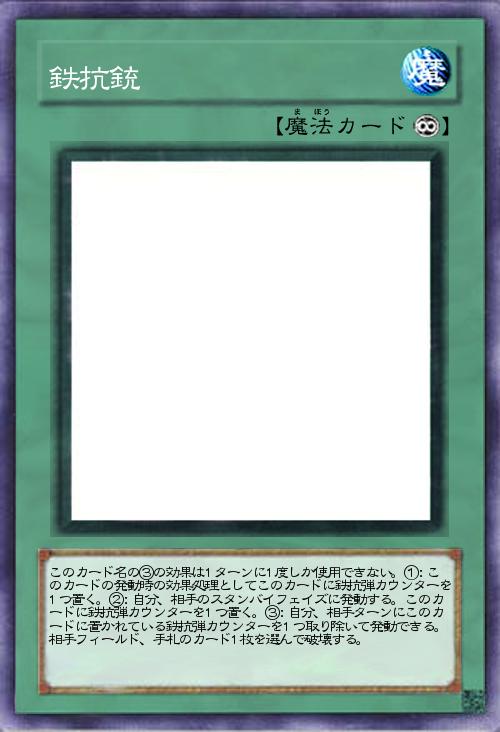 | このカード名の③の効果は1ターンに1度しか使用できない。①:このカードの発動時の効果処理としてこのカードに鉄抗弾カウンターを1つ置く。②:自分、相手のスタンバイフェイズに発動する。このカードに鉄抗弾カウンターを1つ置く。③:自分、相手ターンにこのカードに置かれている鉄抗弾カウンターを1つ取り除いて発動できる。相手フィールド、手札のカード1枚を選んで破壊する。 | |||