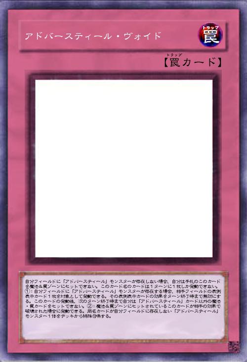 | 自分フィールドに「アドバースティール」モンスターが存在しない場合、自分は手札のこのカードを魔法&罠ゾーンにセットできない。このカード名のカードは1ターンに1枚しか発動できない。①:自分フィールドに「アドバースティール」モンスターが存在する場合、相手フィールドの表側表示カード1枚を対象として発動できる。その表側表示カードの効果をターン終了時まで無効にする。このカードの発動後、次のターン終了時まで自分は「アドバースティール」カード以外の魔法・罠カードをセットできない。②:魔法&罠ゾーンにセットされているこのカードが相手の効果で破壊された場合に発動できる。同名カードが自分フィールドに存在しない「アドバースティール」モンスター1体をデッキから特殊召喚する。 | |||