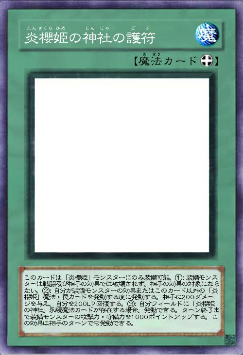 | このカードは「炎櫻姫」モンスターにのみ装備可能。①:装備モンスターは戦闘及び相手の効果では破壊されず、相手の効果の対象にならない。②:自分が装備モンスターの効果またはこのカード以外の「炎櫻姫」魔法・罠カードを発動する度に発動する。相手に200ダメージを与え、自分を200LP回復する。③:自分フィールドに「炎櫻姫の神社」永続魔法カードが存在する場合、発動できる。ターン終了まで装備モンスターの攻撃力・守備力を1000ポイントアップする。この効果は相手のターンでも発動できる。 | |||