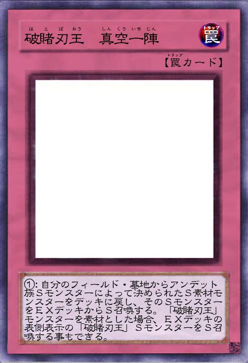 | ①:自分のフィールド・墓地からアンデット族Sモンスターによって決められたS素材モンスターをデッキに戻し、そのSモンスターをEXデッキからS召喚する。「破賭刃王」モンスターを素材とした場合、EXデッキの表側表示の「破賭刃王」SモンスターをS召喚する事もできる。 | |||
