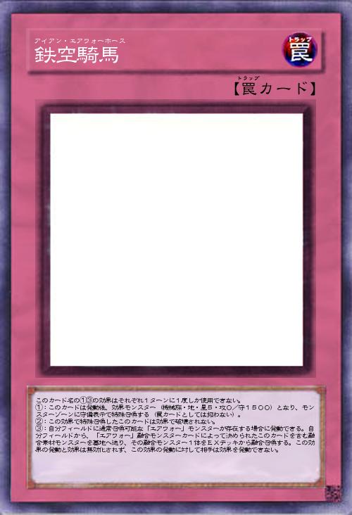 | このカード名の①③の効果はそれぞれ1ターンに1度しか使用できない。 ①:このカードは発動後、効果モンスター(機械族・地・星5・攻0/守1500)となり、モンスターゾーンに守備表示で特殊召喚する(罠カードとしては扱わない)。 ②:この効果で特殊召喚したこのカードは効果で破壊されない。 ③:自分フィールドに通常召喚可能な「エアウォー」モンスターが存在する場合に発動できる。自分フィールドから、「エアウォー」融合モンスターカードによって決められたこのカードを含む融合素材モンスターを墓地へ送り、その融合モンスター1体をEXデッキから融合召喚する。この効果の発動と効果は無効化されず、この効果の発動に対して相手は効果を発動できない。 | |||