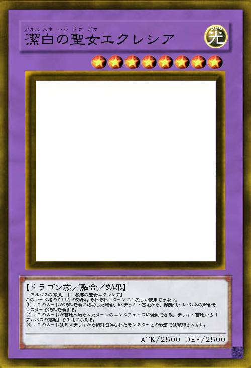 | 「アルバスの落胤」+「教導の聖女エクレシア」 このカード名の(1)(2)の効果はそれぞれ1ターンに1度しか使用できない。 (1):このカードが特殊召喚に成功した場合、EXデッキ・墓地から、闇属性・レベル8の融合モンスターを特殊召喚する。 (2):このカードが墓地へ送られたターンのエンドフェイズに発動できる。デッキ・墓地から「アルバスの落胤」を手札に加える。 (3):このカードはEXデッキから特殊召喚されたモンスターとの戦闘では破壊されない。 | |||
