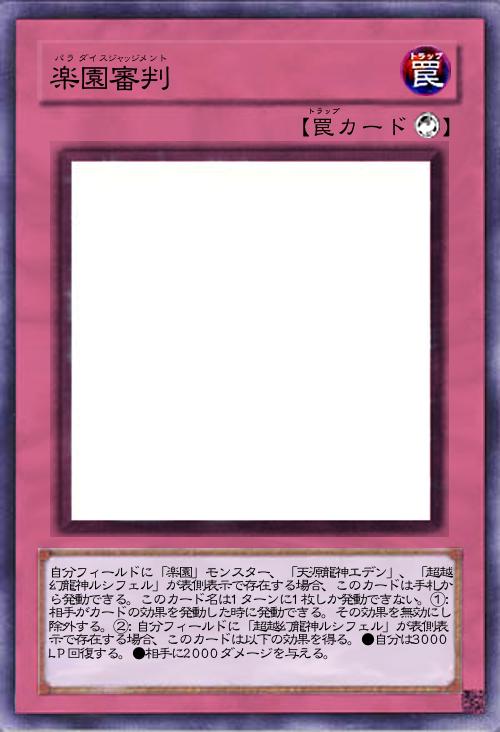 | 自分フィールドに「楽園」モンスター、「天源龍神エデン」、「超越幻龍神ルシフェル」が表側表示で存在する場合、このカードは手札から発動できる。このカード名は1ターンに1枚しか発動できない。①:相手がカードの効果を発動した時に発動できる。その効果を無効にし除外する。②:自分フィールドに「超越幻龍神ルシフェル」が表側表示で存在する場合、このカードは以下の効果を得る。●自分は3000LP回復する。●相手に2000ダメージを与える。 | |||