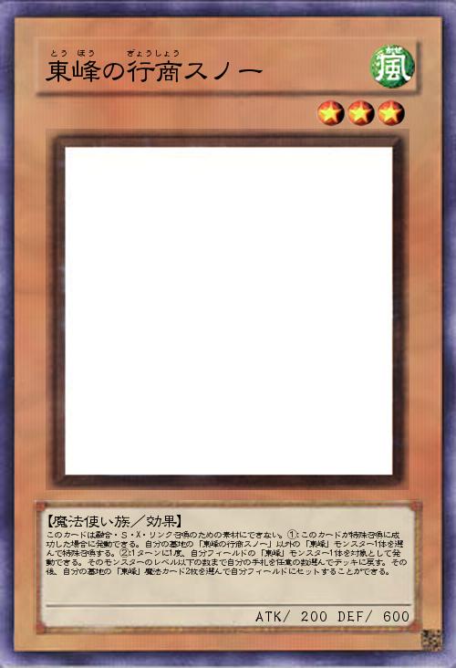 | このカードは融合・S・X・リンク召喚のための素材にできない。①:このカードが特殊召喚に成功した場合に発動できる。自分の墓地の「東峰の行商スノー」以外の「東峰」モンスター1体を選んで特殊召喚する。②:1ターンに1度、自分フィールドの「東峰」モンスター1体を対象として発動できる。そのモンスターのレベル以下の数まで自分の手札を任意の数選んでデッキに戻す。その後、自分の墓地の「東峰」魔法カード2枚を選んで自分フィールドにセットすることができる。 | |||