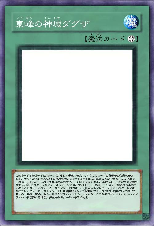 | このカード名のカードは1ターンに1度しか発動できない。①:このカードの発動時の効果処理として、デッキからレベル4以下の風属性モンスター1体を手札に加えることができる。この効果で「東峰」モンスター以外を手札に加えた場合ターン終了時までお互いに同名カードの効果を発動できない。②:このカードがフィールドゾーンに存在する限り、「東峰」モンスターが特殊召喚される度にこのカードにウォーカーカウンターを1つ置く。③:自分エンドフェイズにこのカードに置かれているウォーカーカウンターを任意の数取り除いて発動できる。取り除いた数2つにつき1枚墓地の「東峰」魔法・罠カードを自分フィールドにセットする。この効果でセットされたカードがフィールドを離れる場合、持ち主のデッキの一番下に戻す。 | |||