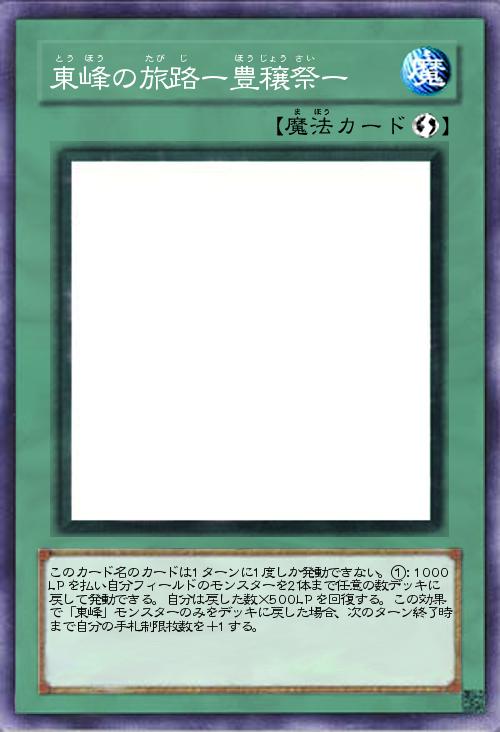 | このカード名のカードは1ターンに1度しか発動できない。①:1000LPを払い自分フィールドのモンスターを2体まで任意の数デッキに戻して発動できる。自分は戻した数×500LPを回復する。この効果で「東峰」モンスターのみをデッキに戻した場合、次のターン終了時まで自分の手札制限枚数を+1する。 | |||