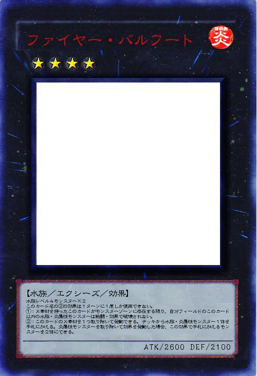 | 水族レベル4モンスター×2 このカード名の②の効果は1ターンに1度しか使用できない。 ①:X素材を持ったこのカードがモンスターゾーンに存在する限り、自分フィールドのこのカード以外の水族・炎属性モンスターは戦闘・効果で破壊されない。 ②:このカードのX素材を1つ取り除いて発動できる。デッキから水族・炎属性モンスター1体を手札に加える。炎属性モンスターを取り除いて効果を発動した場合、この効果で手札に加えるモンスターを2体にできる。 | |||
