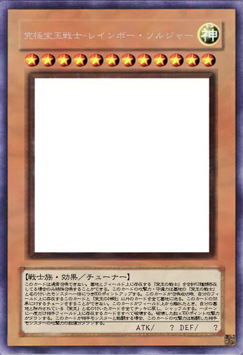 | このカードは通常召喚できない。墓地とフィールド上に存在する「宝玉の戦士」を合計12種類存在してる場合のみ特殊召喚することができる。このカードの攻撃力・守備力は墓地の「宝玉の戦士」と名の付いたモンスター一体につき800ポイントアップする。このカードが召喚成功時、自分のフィールド上に存在するこのカードと「宝玉の神殿」以外のカードを全て墓地に送る。このカードの効果に対するチェーンをすることができない。このカードがフィールド上から離れたとき、自分の墓地と除外されている「宝玉」と名の付いたカードを全てデッキに戻し、シャッフルする。一ターンに一度だけ相手フィールド上に存在するカードをすべて破壊する。破壊した数x700ポイント攻撃力がダウンする。このカードが相手モンスターと戦闘する場合、このカードの攻撃力は戦闘した相手モンスターの攻撃力の数値分ダウンする。 | |||