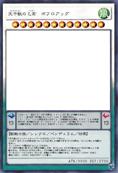 | このカード名の(2)のP効果は、1ターンに1度しか発動できない。 (1):自分は「天干獣」モンスターしか、P召喚できない。 (2):Pゾーンに存在するこのカードが破壊された場合、EXデッキの表側表示の「天干獣の乙亥 ボフロアッグ」以外の「天干獣」モンスター1体を対象に発動できる。そのモンスターを自分フィールドに特殊召喚する。 | |||
