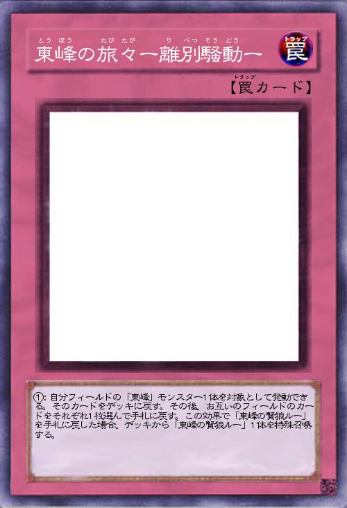 | ①:自分フィールドの「東峰」モンスター1体を対象として発動できる。そのカードをデッキに戻す。その後、お互いのフィールドのカードをそれぞれ1枚選んで手札に戻す。この効果で「東峰の賢狼ルー」を手札に戻した場合、デッキから「東峰の賢狼ルー」1体を特殊召喚する。 | |||