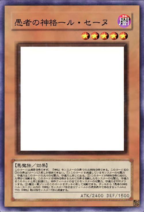 | このカードは通常召喚できず、「神格」モンスターの効果でのみ特殊召喚できる。このカード名の③の効果は1ターンに1度しか使用できない。①:このカードを装備しているモンスターの攻撃力、守備力はこのカードの元々の攻撃力、守備力と同じになる。②:このカードが特殊召喚に成功した場合に発動する。このカードを特殊召喚するために効果を発動したモンスターの攻撃力、守備力をこのカードと同じ数値にし、相手フィールドの全てのモンスターの攻撃力、守備力を1000ダウンする。③:魔法・罠ゾーンのこのカードをデッキに戻して発動できる。デッキから「愚者の神格ール・セーヌ」以外の「神格」モンスター1体を自分フィールドの表側表示で存在するレベル4以下の「神格」戦士族モンスター1体に装備する。 | |||